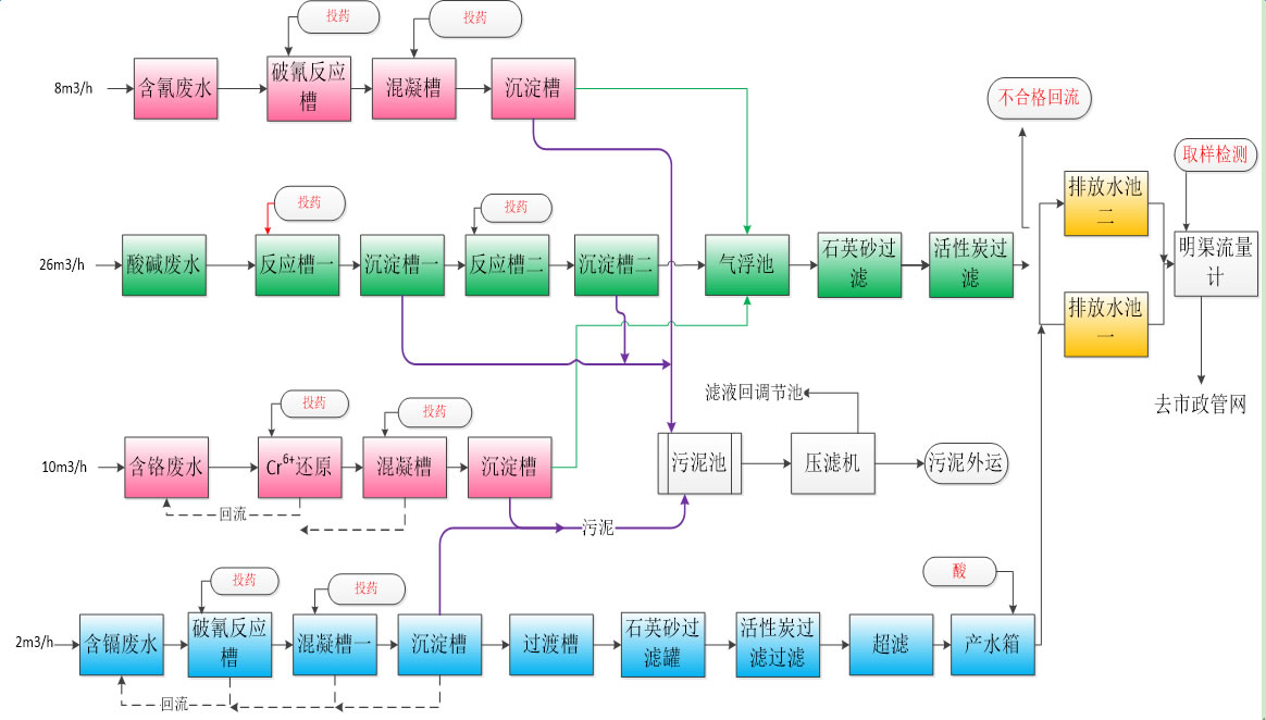 該處理系統(tǒng)根據(jù)鍍種及廢水性質不同,擬選用分散與集中相結合的工藝流程處理各種電鍍廢水,使處理后的廢水穩(wěn)定達到排放標準。系統(tǒng)主要包括:酸堿廢水處理系統(tǒng)、含鉻廢水處理系統(tǒng)、含氰廢水處理系統(tǒng)、含鎘廢水處理系統(tǒng)、污泥脫水處理系統(tǒng)、配藥系統(tǒng)、壓縮空氣攪拌系統(tǒng)、污水處理站通風系統(tǒng)、自動控制及配套系統(tǒng)等。項目設計選取工藝先進、流程合理、運行可靠、穩(wěn)定達標的成熟工藝。系統(tǒng)設計配以先進的自控系統(tǒng),能實現(xiàn)自動化與手動雙系統(tǒng)控制。